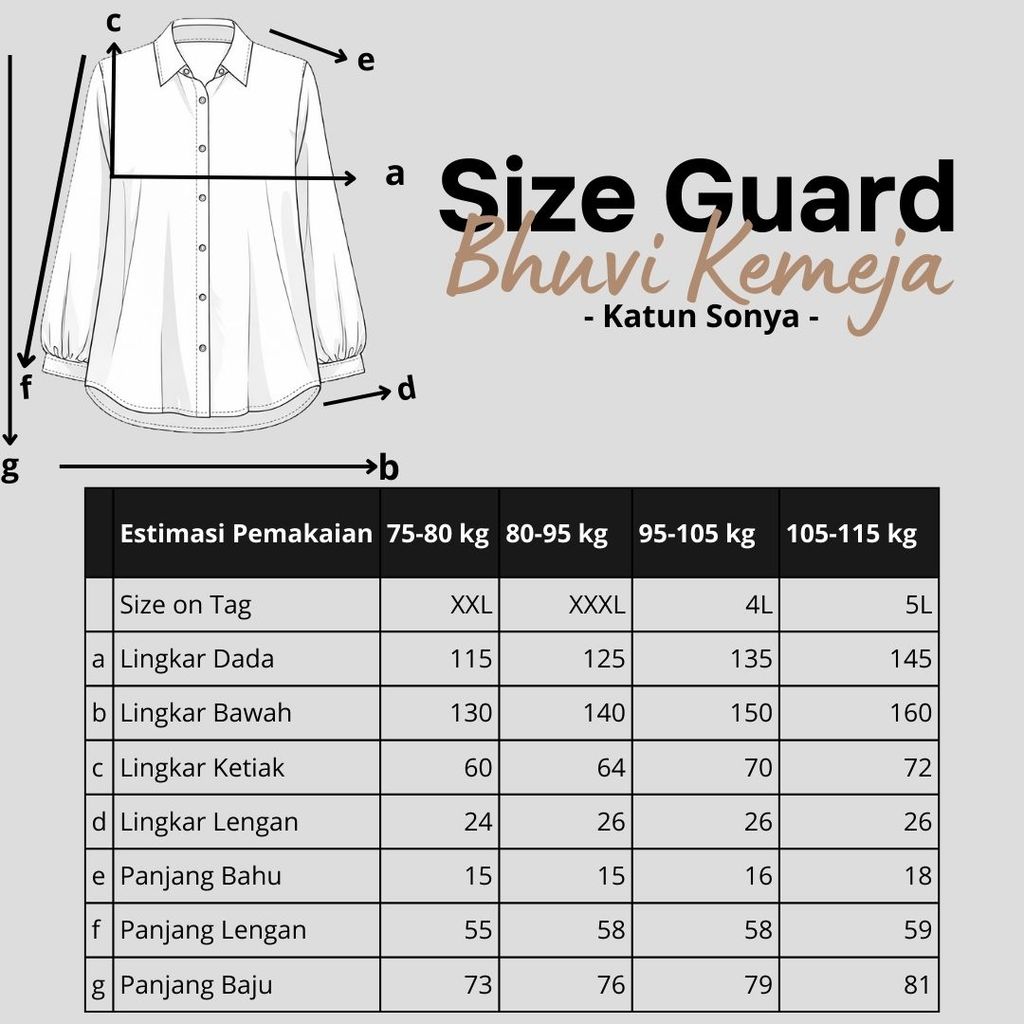 Detail Produk ` Bahan katun sonya full motif floral pinstripe (no strech, halus, licin) ` Kemeja cutting a-line ` Leher berkerah (shirt collar) ` lengan panjang, pergelangan berkancing ` Penutup full kancing hidup (busui friendly) Detail Size ' Size on tag . XXL / XXXL / 4L / 5L ' Lingkar dada . 115 / 125 / 135 / 145 ' Lingkar bawah . 130 / 140 / 150 / 160 ' Lingkar ketiak . 60 / 64 / 70 / 72 ' Lingkar lengan . 24 / 26 / 26 / 26 ' Panjang bahu . 15 / 15 / 16 / 18 ' Panjang lengan . 55 / 58 / 58 / 59 ' Panjang baju . 73 / 76 / 79 / 81 Note. ' Lingkar bawah = Lingkar paling bawah / lingkar pinggul ' Detail size diatas adalah hasil perataan sample acak ukur, perbedaan ukuran dari yang tertera diatas merupakan hal wajar karena produksi masal. Untoleransi ukuran / komplain ukuran jika ukuran pada produk lebih kecil / setara dengan ukuran yang diatasnya. ` Persentase kemiripan antara foto dan keaslian produk adalah 98% ` Tidak ada garansi tukar size ` Ketersediaan stok sesuai etalase, produk yang kosong akan kami konfirmasi sebelum di kirim, pastikan selalu memeriksa Chat pukul 18.00 untuk membalas konfirmasi jika produk kosong. Pengiriman : ` pembayaran sebelum jam 15.00 ikut pengiriman di hari yang sama (reguler pengiriman masal pukul 18.00 / instant atau sameday diproses setiap jam pada 08.00 - 15.00) ` Pesanan yang masuk diluar jam diatas, akan ikut pengiriman di keesokan harinya Waktu pengiriman : ` J&T/Instant/Sameday pengiriman setiap hari ` Membeli = setuju, happy shop ^.^