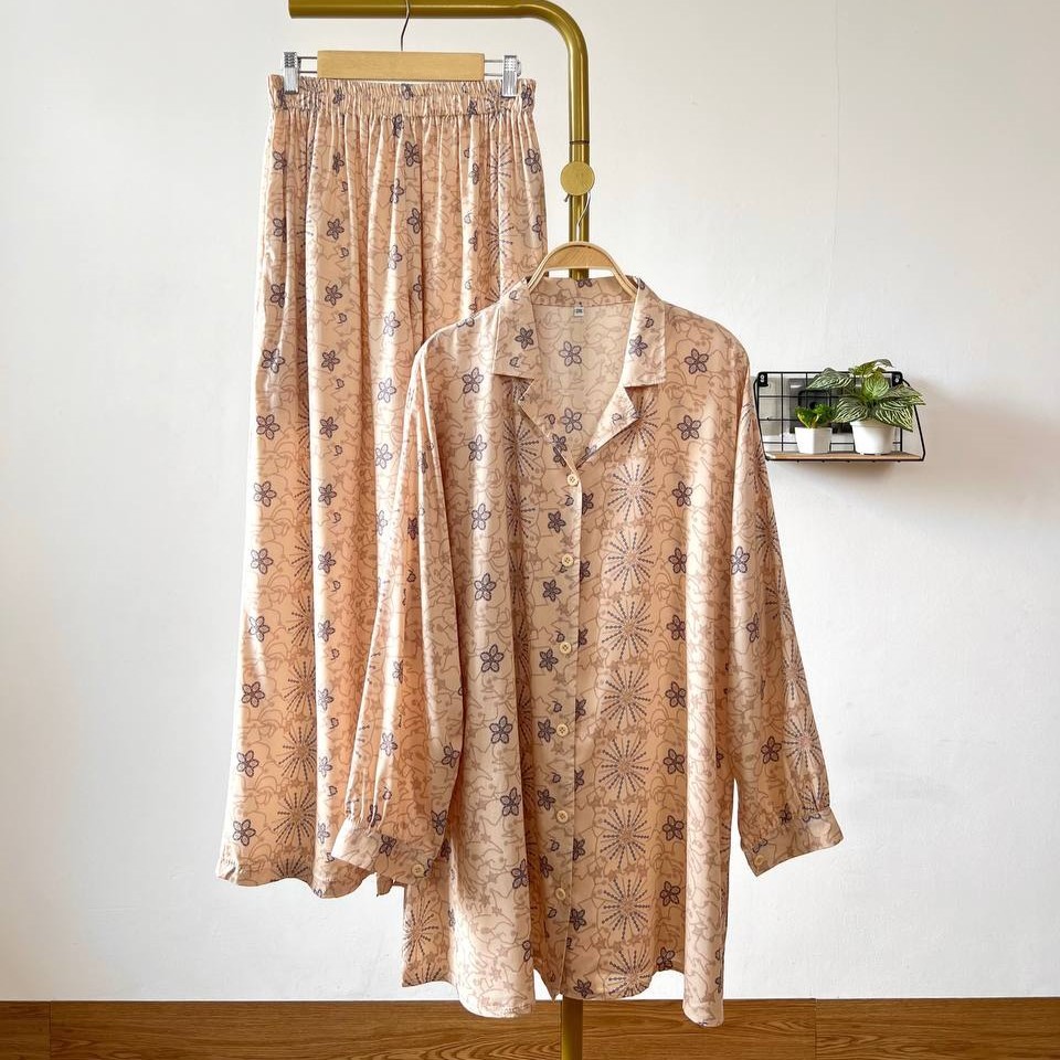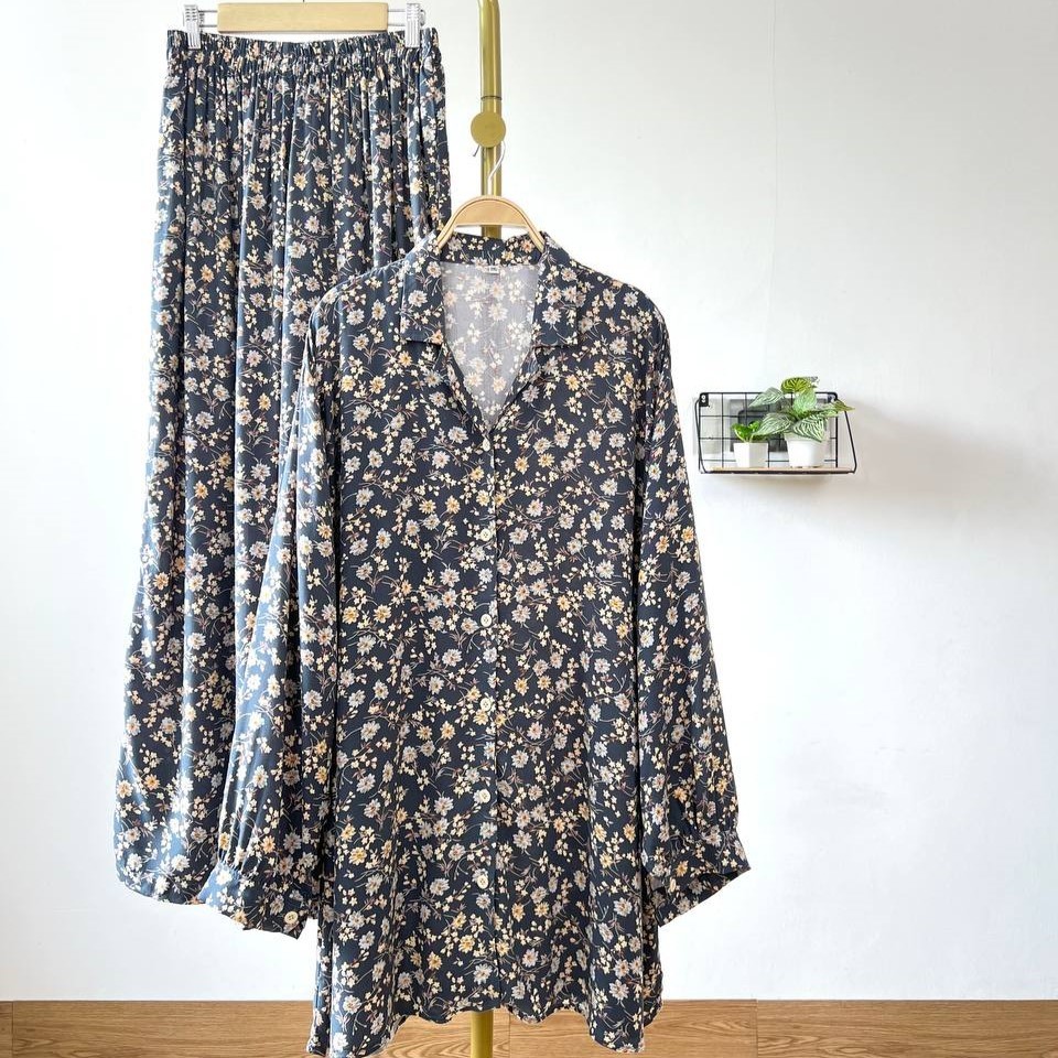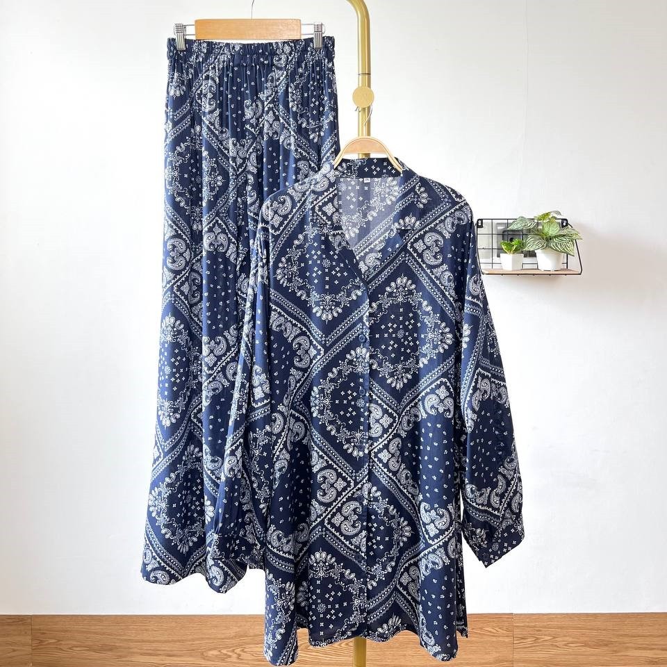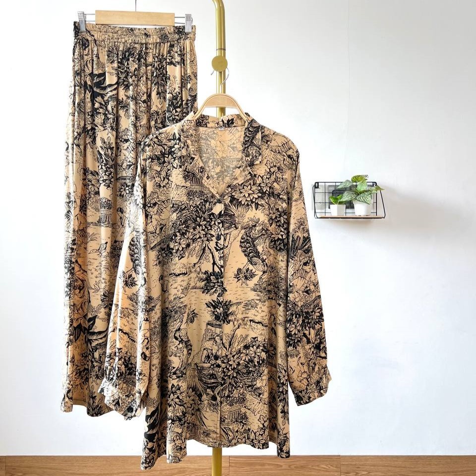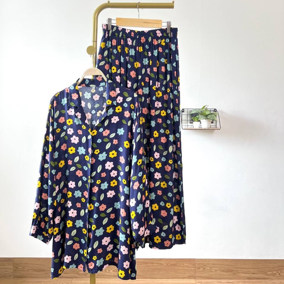 Detail Produk ` Bahan Rayon ( non Stretch) ` Atasan cutting A-Line model kemeja ` Bawahan cutting V-line / Baggy pants ` Kerah model Shirt Collar ` Penutup full kancing (Busui friendly) ` Lengan panjang, pergelangan berkancing ` Lingkar pinggang full karet (bumil friendly) ` Kantong celana kanan dan kiri Detail Size Atasan ' Lingkar dada . 110 / 120 / 130 / 140 / 150 ' Lingkar tengah . 120 / 135 / 140 / 150 / 160 ' Lingkar bawah . 135 / 150 / 155 / 170 / 180 ' Lingkar ketiak . 58 / 66 / 66 / 66 / 70 ' Lingkar siku . 42 / 48 / 50 / 50 / 54 ' Lingkar pergelangan . 28/ 32 / 33 / 35 / 35 ' Panjang bahu . 15/ 16 / 17 / 18 / 19 ' Panjang lengan . 54 / 54 / 54 / 56 / 57 ' Panjang baju . 77 / 81 / 81 / 83 / 86 Bawahan ' Lingkar pinggang . 63-120 / 65-130 / 65-140 / 70-145 / 70-145 ' Lingkar pinggul . 120 / 130 / 145 / 160 / 170 ' Lingkar Paha . 70 / 80 / 90 / 95 / 100 ' Lingkar Kaki . 64 / 70 / 75 / 75 / 75 ' Panjang Celana . 98 / 99 / 99 / 99 / 99 ' Tinggi Pesak . 37 / 38 / 38 / 40 / 40 Note. ' Lingkar bawah = Lingkar paling bawah / lingkar pinggul ' Detail size diatas adalah hasil perataan sample acak ukur, perbedaan ukuran dari yang tertera diatas merupakan hal wajar karena produksi masal. Untoleransi ukuran / komplain ukuran jika ukuran pada produk lebih kecil / setara dengan ukuran yang diatasnya. ` Persentase kemiripan antara foto dan keaslian produk adalah 98% ` Tidak ada garansi tukar size ` Ketersediaan stok sesuai etalase, produk yang kosong akan kami konfirmasi sebelum di kirim, pastikan selalu memeriksa Chat pukul 18.00 untuk membalas konfirmasi jika produk kosong. Pengiriman : ` pembayaran sebelum jam 15.00 ikut pengiriman di hari yang sama (reguler pengiriman masal pukul 18.00 / instant atau sameday diproses setiap jam pada 08.00 - 15.00) ` Pesanan yang masuk diluar jam diatas, akan ikut pengiriman di keesokan harinya Waktu pengiriman : ` J&T/Instant/Sameday pengiriman setiap hari ` Membeli = setuju, happy shop ^.^
