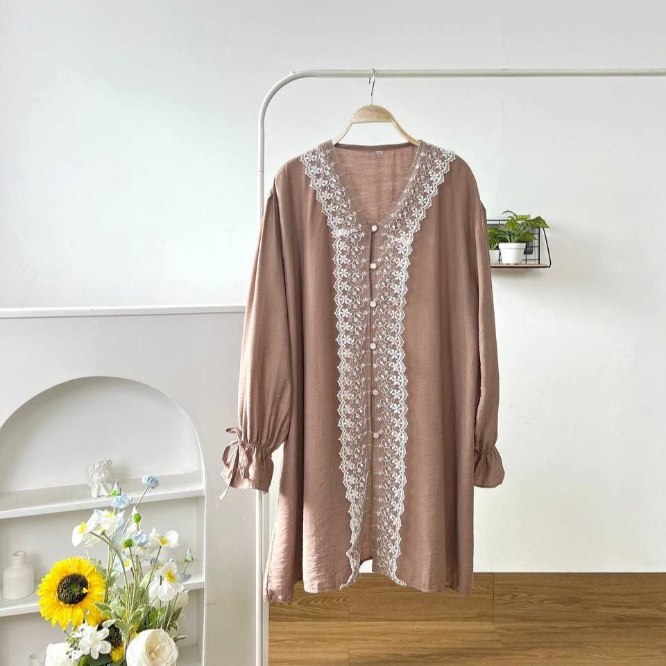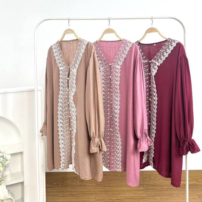 Detail Produk ` Bahan linen polos mix variasi lace (no strech) ` Tunik cutting a-line ` Leher tanpa kerah / V-neck ` Penutup full kancing hidup (tougle) ` Lengan panjang, pergelangan terompet ` Variasi tali hidup dibagian lengan ` Lace dibagian depan Detail Size ' Lingkar dada . 120 / 130 / 140 / 150 ' Lingkar bawah . 150 / 160 / 170 / 180 ' Lingkar ketiak . 64 / 68 / 72 / 76 / ' Lingkar lengan . 28 / 30 / 32 / 34 ' Panjang bahu . 15 / 16 / 17 / 18 ' Panjang lengan . 54 / 59 / 60 / 63 ' Panjang baju . 85 / 88 / 91 / 93 Note. ` Detail size diatas adalah hasil perataan sampel acak ukur, perbedaan ukuran dari yang tertera diatas merupakan hal wajar karen produksi masal. Intoleransi ukuran / komplain ukuran jika ukuran pada produk lebih kecil / setara dengan ukuran yang diatasnya ` Persentase kemiripan antara foto dan keaslian produk adalah 98% ` Tidak ada garansi tukar size ` Ketersediaan stok sesuai etalase, produk yang kosong akan kami konfirmasi sebelum di kirim, pastikan selalu memeriksa Chat pukul 18.00 untuk membalas konfirmasi jika produk kosong. Pengiriman : `Senin - Minggu (Sebelum jam 15.00 ikut pengiriman di hari yang sama) #Pesanan yang masuk diluar jam diatas, akan ikut pengiriman di keesokan harinya ` Membeli = setuju, happy shop ^.^